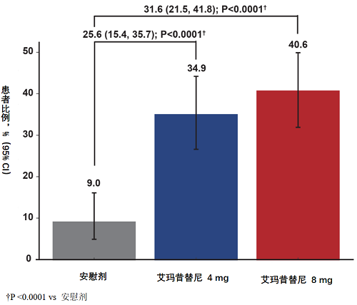研究主要终点的结果显示,在第24周时硫酸艾玛昔替尼片4 mg/8 mg和安慰剂组的SALT评分≤20的患者比例分别为34.9%、40.6%和9%,与安慰剂组相比,4 mg组和8 mg组的应答率差异分别为25.6%(95% CI:15.4-35.7,双侧p<0.0001)和31.6%(95% CI:21.5-41.8,双侧p<0.0001)(图2)。