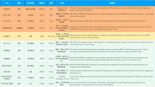 在胸腺上皮肿瘤、头颈鳞癌、肉瘤、前列腺癌、甲状腺癌等其他多个疾病领域,卡瑞利珠单抗、阿帕替尼、瑞维鲁胺、阿得贝利单抗、法米替尼、HRS-7058、HRS-4642、HRS-5041等抗肿瘤创新药相关研究一共入选了4项口头报告、1项简短口头报告、5项壁报,彰显了z6尊龙官方网站医药强大的研发实力。此外,海曲泊帕和昂丹司琼口溶膜分别在防治化疗导致的血小板减少和恶心呕吐方面各有1项研究入选壁报。